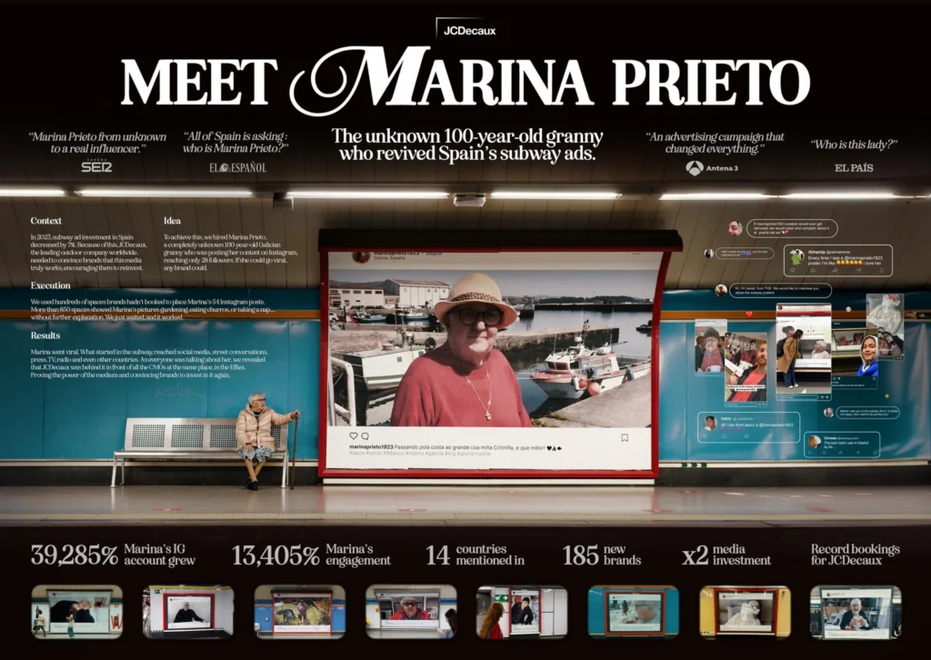 In the bustling heart of Madrid, a unique advertising campaign recently took the city by storm, captivating thousands of daily commuters and proving that even the most unexpected personalities can become social media sensations. This campaign, masterminded by JCDecaux and DAVID Madrid, centered around Marina Prieto, a 100-year-old woman whose life and personality shone brightly across the Metro’s advertising spaces: Meet Marina Prieto