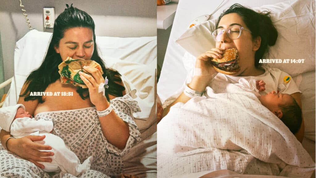 Burger King’s campaign began with insights from a Mumsnet survey. The results were both surprising and validating: 39% of new mothers reported that their first post-birth meal was the most satisfying meal they’d ever had. This feedback became the foundation of the “Bundles of Joy” campaign, which features real moms indulging in their post-birth Whopper meals, with the exact moment of their burger delivery printed on each ad, alongside their baby’s arrival time.