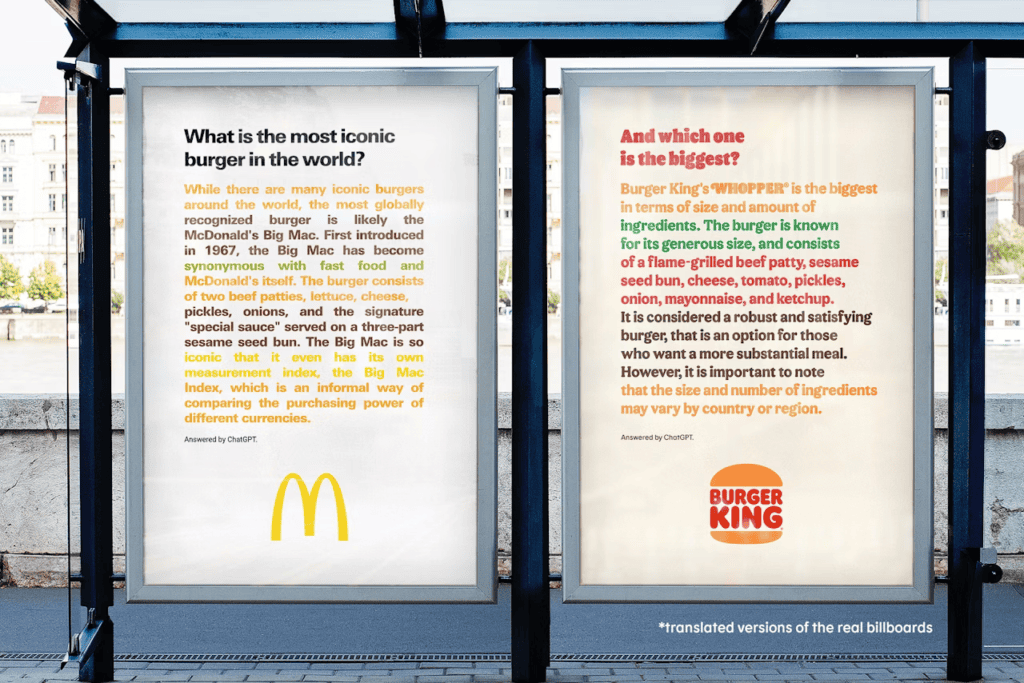 In June 2023, Burger King and McDonald’s went head-to-head in a hilarious and creative campaign that utilized ChatGPT. The campaign began with McDonald’s unveiling a simple yet effective billboard that posed the question: “What is the most iconic burger in the world?” The text was displayed in a bold font, with the colors changing to represent the various layers of a Big Mac, McDonald’s signature burger. Burger King answered.